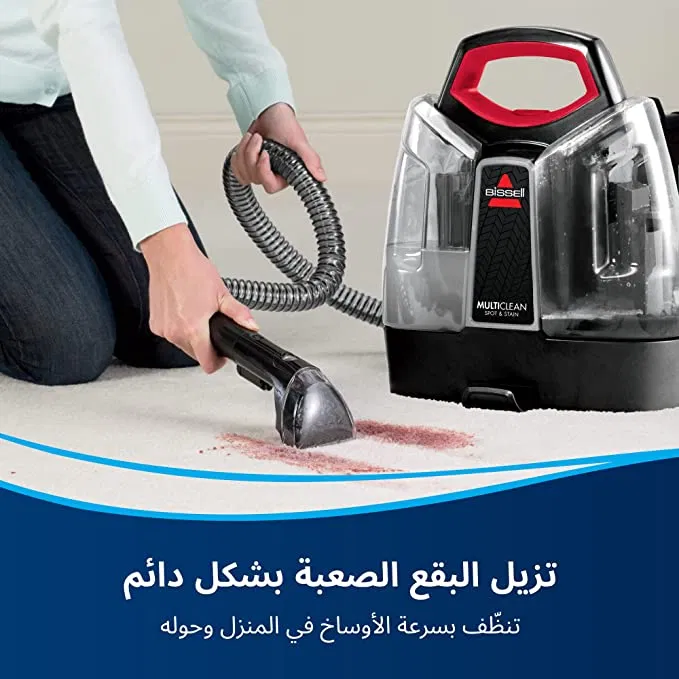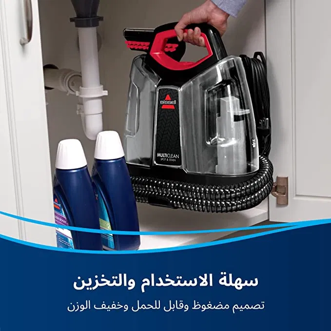 تزيل تركيبة بيسل ملتي كلين سبوت وبقع المزودة بالأكسجين بشكل دائم البقع الصعبة واللطخات، وتنظف بسرعة مجموعة متنوعة من الأوساخ في المنزل وحوله. ويتضمن منظف البقع بيسل ملتي كلين سبوت وبقع خزان مياه قابل للإزالة يسهل ملؤه وتفريغه. تسمح تقنية الخزانين بالقيام بعملية التنظيف باستخدام الماء النظيف بينما يتم تخزين الأوساخ في خزان مختلف يسهل فكه وتنظيفه. كما تساعد تقنية الموجات الحرارية في الحفاظ على درجة حرارة ثابتة للماء الدافئ أثناء التنظيف. ويعدّ أفضل نظام تنظيف لدينا لأصعب البقع والروائح - حتى أنه يزيل الروائح الكريهة. بمجرد الانتهاء من التنظيف، يسهل تفريغ خزان المياه المتسخ وتنظيفه بدون عناء. يحتوي منظف بيسل ملتي كلين سبوت وبقع على 4 أدوات متخصصة وينظّف بسرعة الأوساخ على السجاد والمفروشات والسلالم والفرش الداخلي للسيارة. يمكن استخدامه أيضًا على الأسطح الناعمة مثل الأرائك والمقاعد ومراتب السرير وغيرها. ويجعل تصميمه العصري المضغوط من السهل تخزينه في أماكن مناسبة مثل الخزانة أو حتى تحت الحوض، كما يمكن حمله ويعتبر خفيف الوزن. يحتوي على عصا بطول 2.2 متر للوصول إلى مناطق مختلفة من منزلك وسيارتك وتنظيفها بطريقة مثالية.
